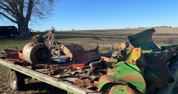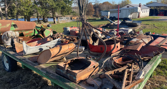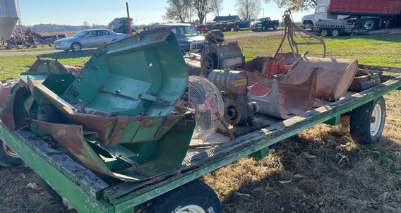 AC tractor parts; 34” and 38” duals; AC 426 combine motor for parts; 6’ 3 pt blade; WW wood chipper; Antique corn sheller; 14’ pick-up ladder rack; Delta tool box; Poly Marathon fuel sign 6x8’; Kawasaki electric power wheels ride-on toy; Tractor and implement tires; Boat gas tanks; chain saws.